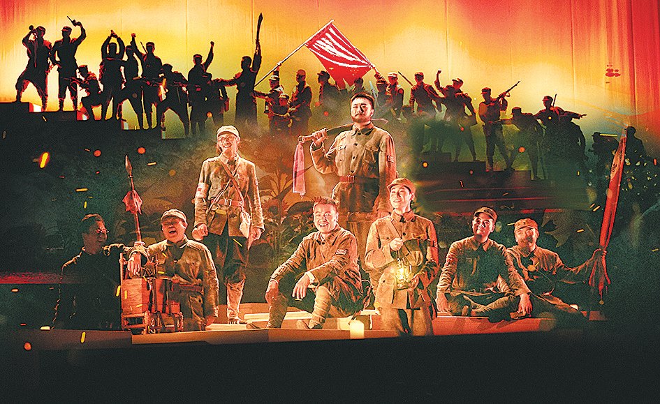 小说提供了坚实的改编基础。而话剧改编面临的问题是,如何将小说的文学性,凝练到舞台之上,丰满出一个又一个新四军战士的群像。为此我翻阅新四军回忆史料,翻阅通信兵文集,走访安徽省新四军研究会。直觉告诉我,这将是一个全男阵容的军旅戏、硬汉戏。戏中没有女性角色,甚至没有敌人和对手。没有女性戏剧可能就缺失了色彩,没有对手和敌人,就意味着丢掉了冲突的对立面。在戏剧舞台上我们做了大胆尝试,满台新四军战士汇成一条奔腾的铁流,势不可挡向着目标前进;这诗意的一幕,就是戏剧的高潮!
