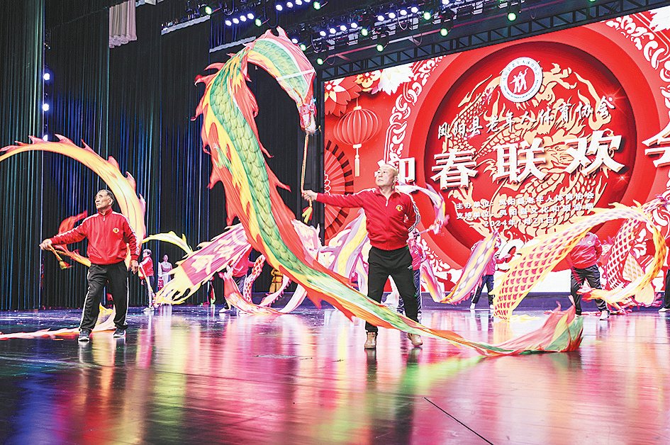 1 月 21 日,凤阳县花鼓大剧院内花鼓欢唱,祥龙飞舞,由凤阳县老年人体育协会主办,县文化和旅游局提供支持的“凤阳县老体协2024年迎春联欢会”浓情上演,来自县老体协的 50 多个分会和文体团队的 1000 多名会员代表与演员们欢聚一堂,共迎新年。吴晓泉 王培正/摄影报道