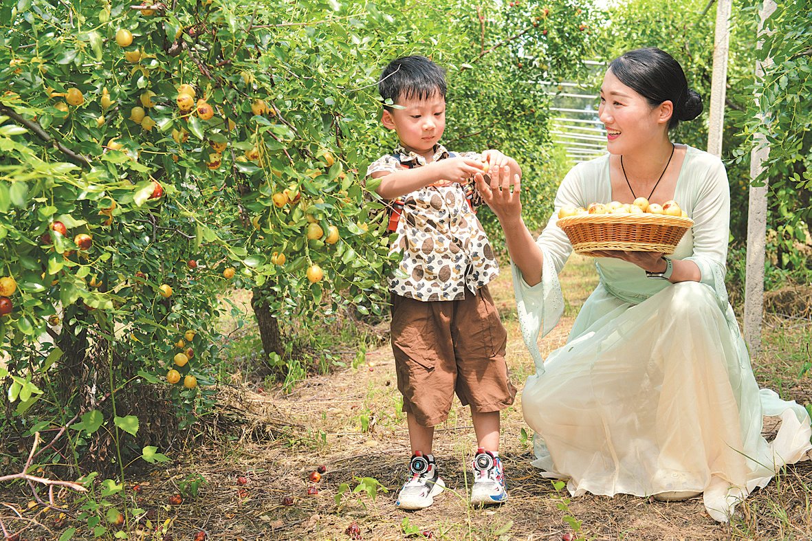 8 月 22 日,在阜阳市颍泉区宁老庄镇枣树行村,游客在果园内采摘成熟的玉铃铛枣。