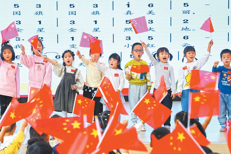 日前,六安市裕安区城北幼儿园开展主题教育活动,通过认识国旗、学唱红歌、表演短剧、观看大国重器视频等形式,进行爱国主义教育,表达对祖国的热爱和祝福,迎接新中国76周年华诞。田凯平/摄