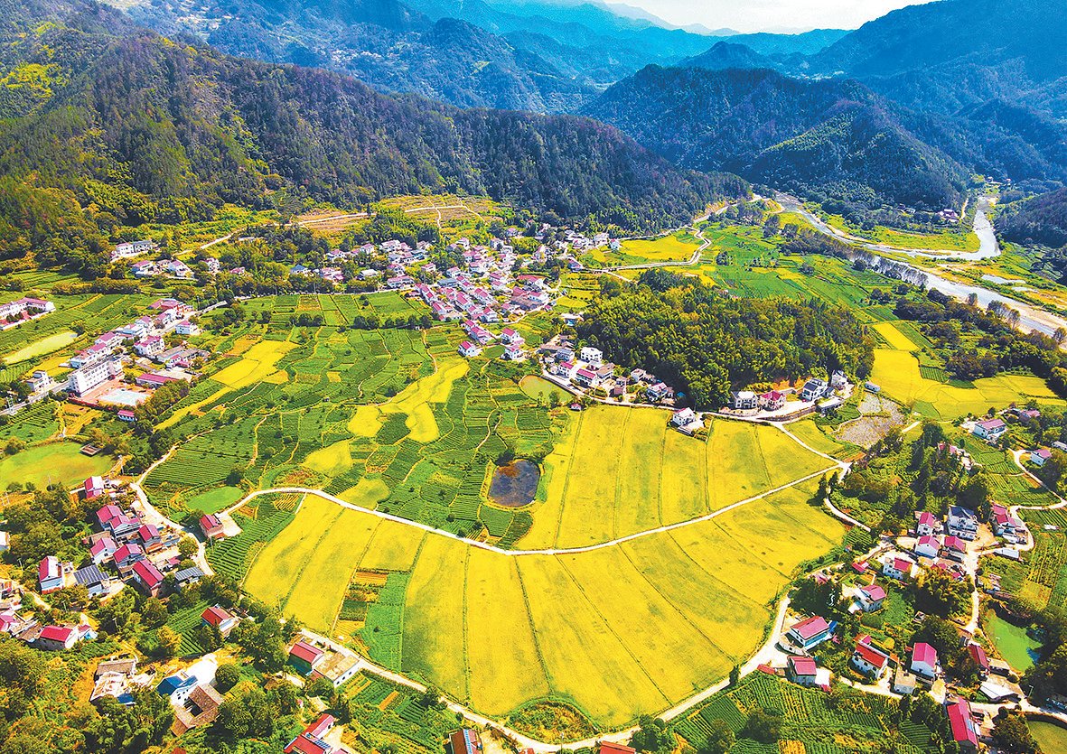 9 月 26 日,在安庆市岳西县菖蒲镇水畈村,金黄的稻田如大地织锦,与红顶民居、翠绿茶园相映成趣,勾勒出一幅丰收时节的大别山腹地美丽乡村田园新画卷。