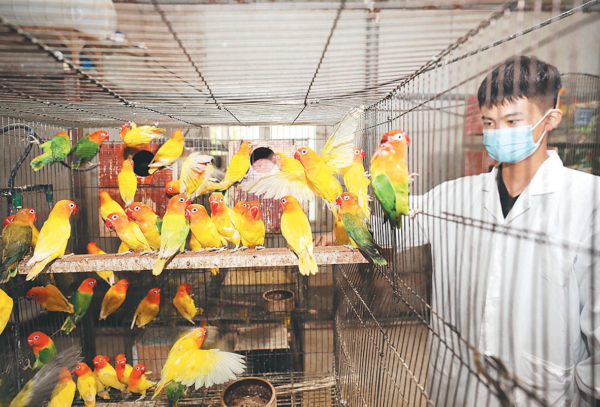 9月27日,在淮北市濉溪县四铺镇四铺村晓晓特种养殖场,工人正在饲养鹦鹉。