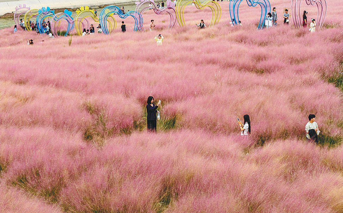 国庆期间,合肥市庐江县温泉小镇汤池镇百余亩粉黛乱子草花开正盛,粉黛花海悄然绽放,如红色云雾般,令人震撼,游人置身其间,犹如走进梦幻之中。“网红草”吸引了八方游客前来观赏,成为皖中闻名的一处旅游打卡地。