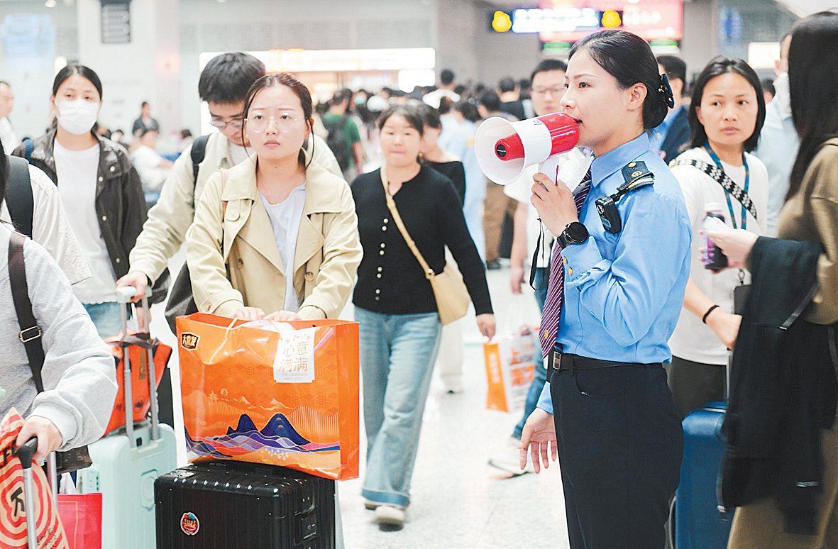 10月7日,在高铁阜阳西站,站内值班人员在引导旅客有序乘车。10月7日至8日,高铁阜阳西站迎来国庆中秋假期旅客返程客流高峰,站内工作人员以及阜阳西站派出所民警积极为旅客提供照顾老人孩子、指引列车信息服务、宣传反诈知识等温馨便民服务,倾力守护旅客平安出行。