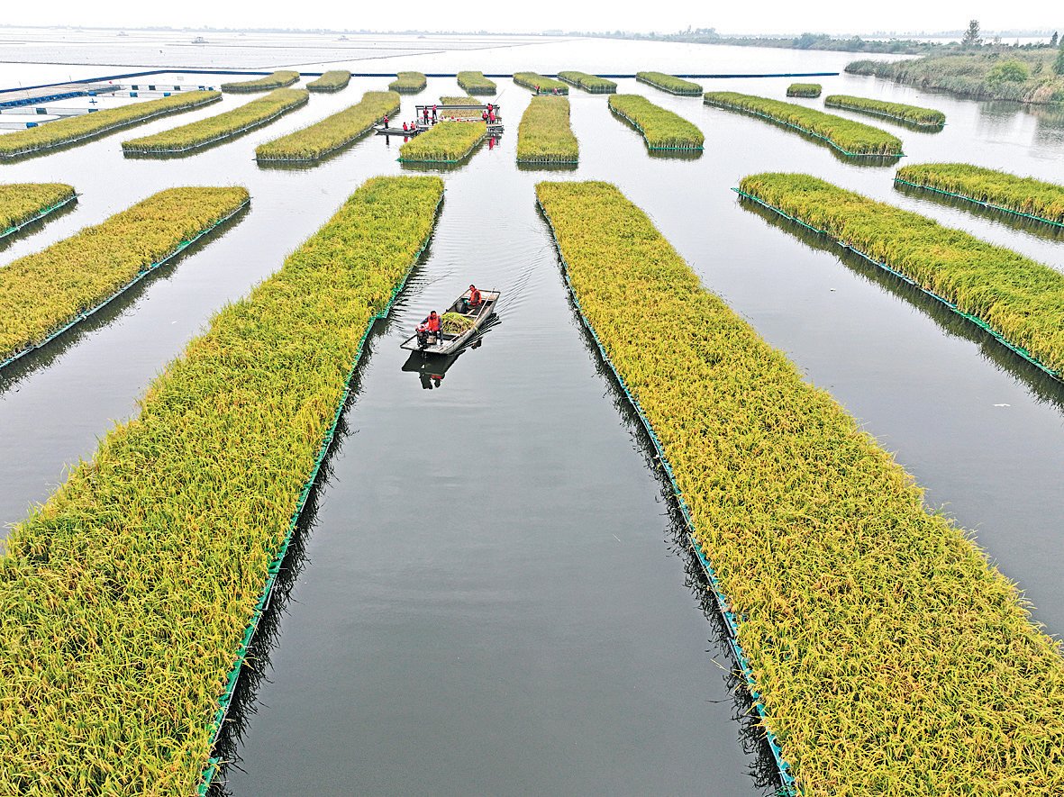 10月14日,淮河能源控股集团组织人员在淮南市凤台县顾桥镇采煤沉陷区水面上收获50亩漂浮式水稻,该漂浮式水稻种植项目亩均产量达到500公斤以上。