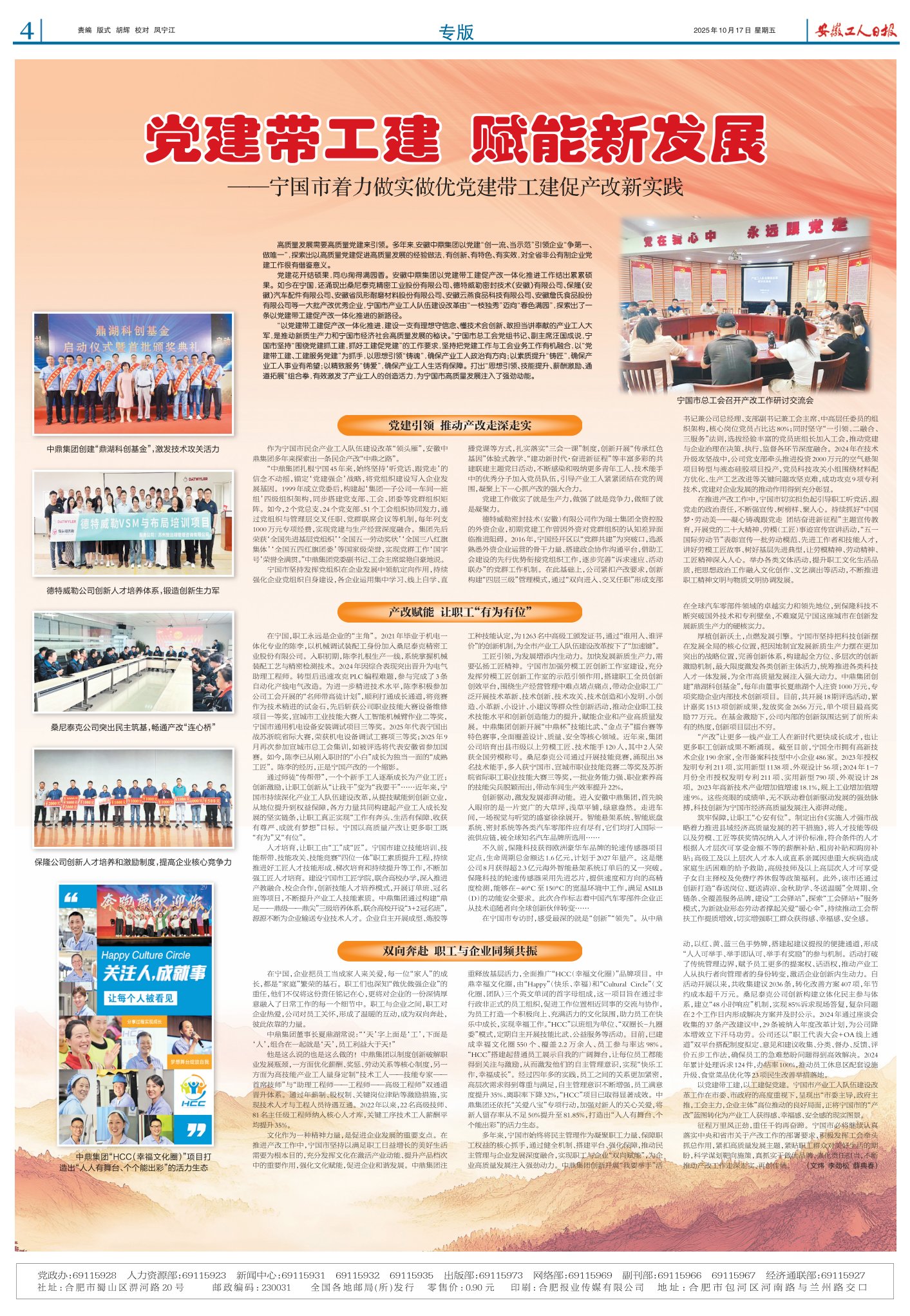 “中鼎集团扎根宁国45年来,始终坚持‘听党话、跟党走’的信念不动摇,锚定‘党建强企’战略,将党组织建设写入企业发展基因。1999年成立党委后,构建起‘集团—子公司—车间—班组’四级组织架构,同步搭建党支部、工会、团委等党群组织矩阵。如今,2个党总支、24个党支部、51个工会组织协同发力,通过党组织与管理层交叉任职、党群联席会议等机制,每年列支1000 万元专项经费,实现党建与生产经营深度融合。集团先后荣获‘全国先进基层党组织’‘全国五一劳动奖状’‘全国三八红旗集体’‘全国五四红旗团委’等国家级荣誉,实现党群工作‘国字号’荣誉全满贯。”中鼎集团党委副书记、工会主席梁艳自豪地说。