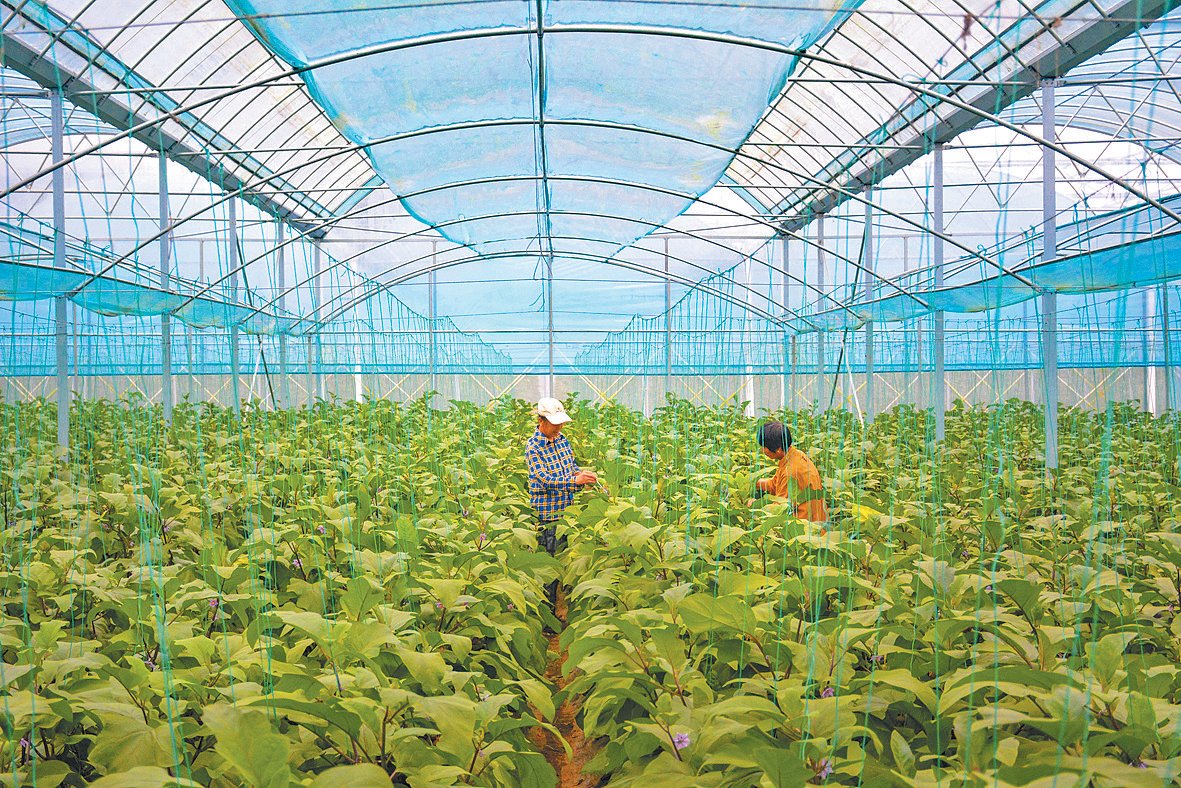 近日,在安庆市岳西县温泉镇解放村,村民在蔬菜大棚里管护茄子。眼下,当地蔬菜管理进入关键期,村民们抢抓农时,依托大棚内的智能环境调控系统、精准水肥供给等智慧农业设施与技术,对蔬菜开展精细化管护,为蔬菜优质高产保驾护航。