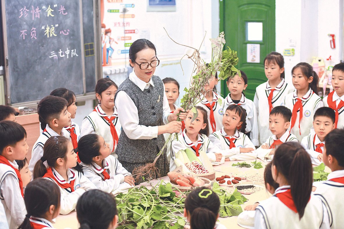 日前,阜阳市实验小学北京路校区的老师在教室内利用粮食作物向小学生们讲解节约粮食知识。