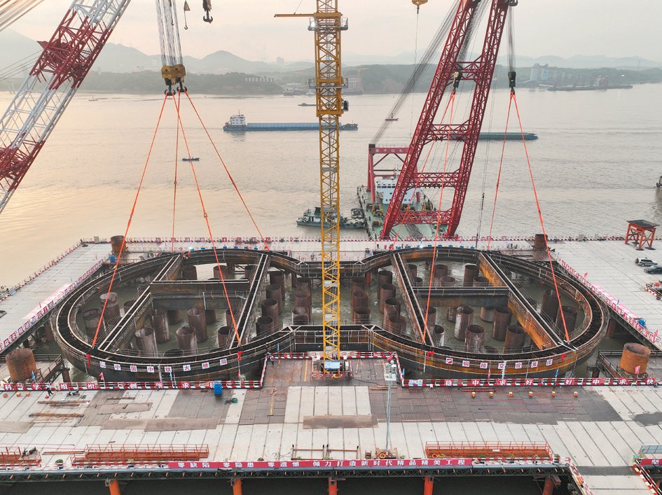 2022年5月30日,铜陵长江三桥3号主墩钢围堰第一节吊装就位。