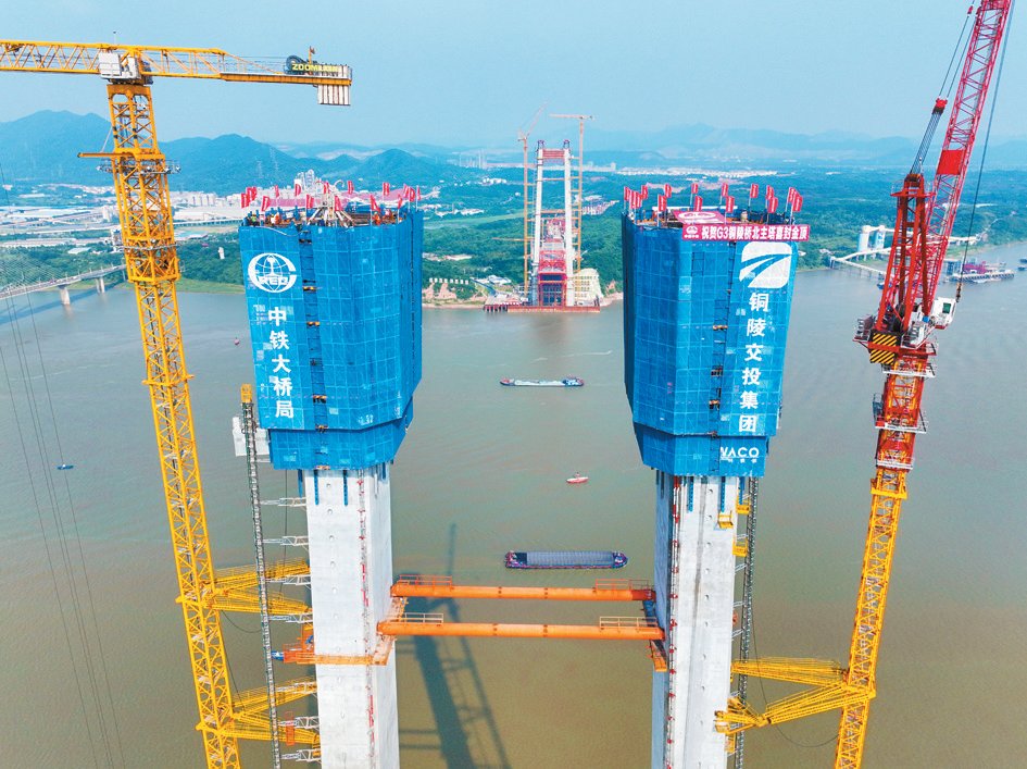 2023年8月18日,铜陵长江三桥3号主塔封顶,至此大桥南北两座主塔全部封顶,将全面进入钢梁架设阶段。