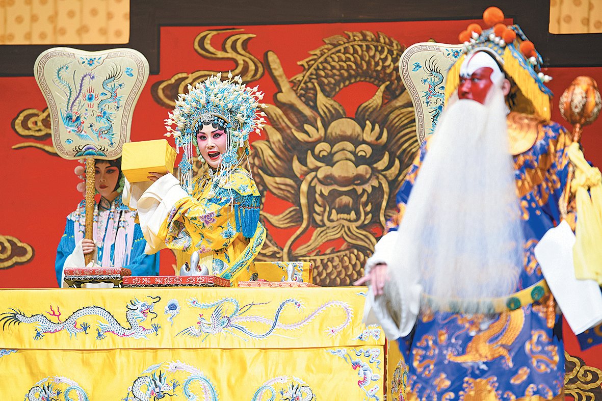 11 月 8 日,北京京剧院演员侯美(中)在淮南剧院主演京剧《大保国·探皇陵·二进宫》。