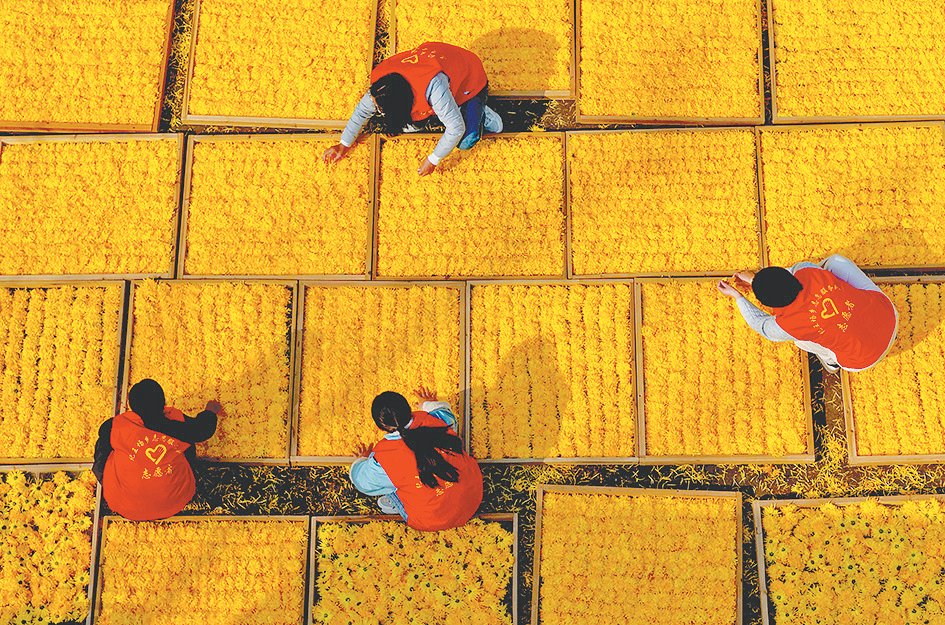 11月14日,在亳州市利辛县纪王场乡田湖社区,党员志愿者在帮助农民整理分拣金丝皇菊,准备烘干供应市场。