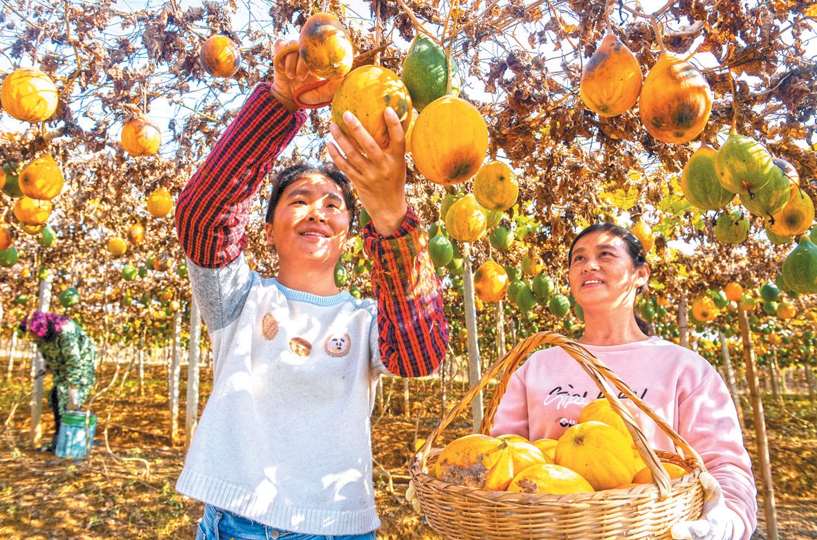 11月13日,马鞍山市含山县铜闸镇益明家庭农场瓜蒌地,村民在采收成熟的瓜蒌。近年来,含山县铜闸镇充分利用资源优势,加快农业产业结构调整,通过“农场+基地+农户”的种植模式,大力发展瓜蒌种植产业,推广瓜蒌新品种,延伸拓展产业链,促进农业增效、农民增收,助力乡村振兴。欧宗涛 夏祖花/摄影报道